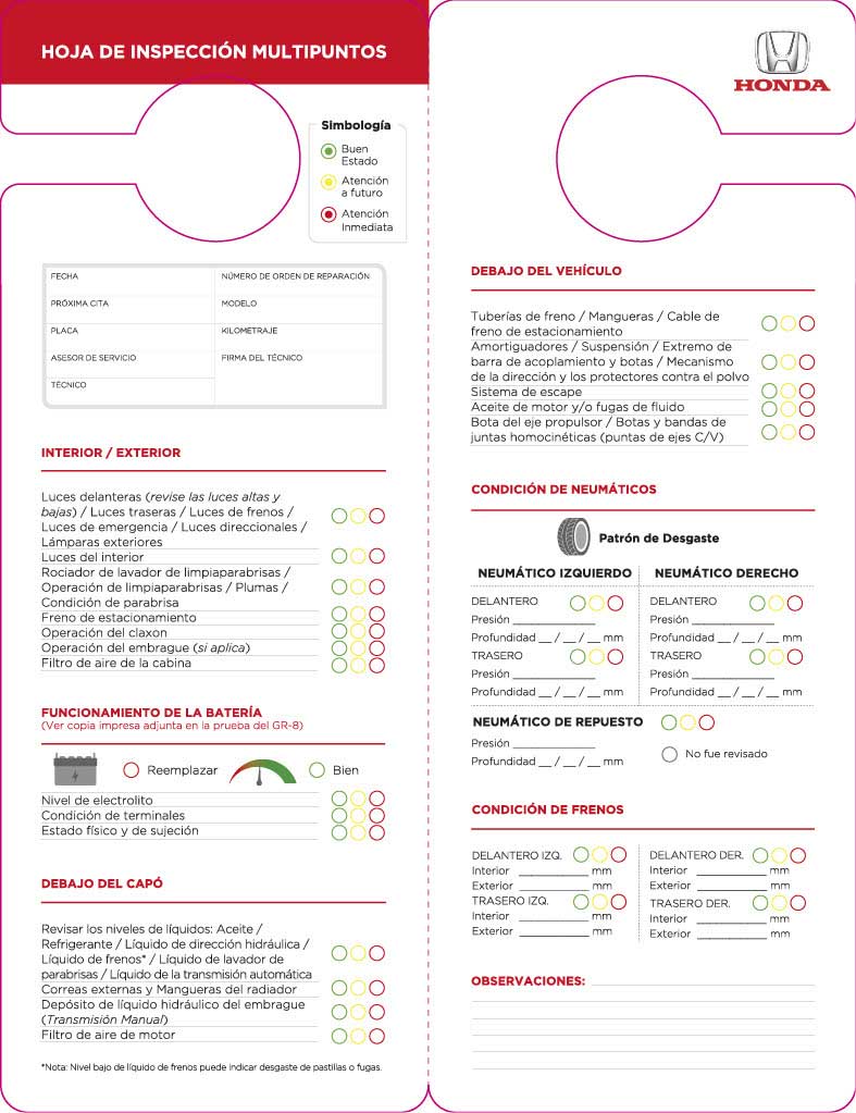 La hoja multipuntos te da una referencia del estado de tu Honda, es llenado por técnicos certificados y entregado después de tu servicio como recordatorio de los puntos de atención para tu próxima visita, tu Asesor de Servicio te brindara una explicación detallada de la hoja.